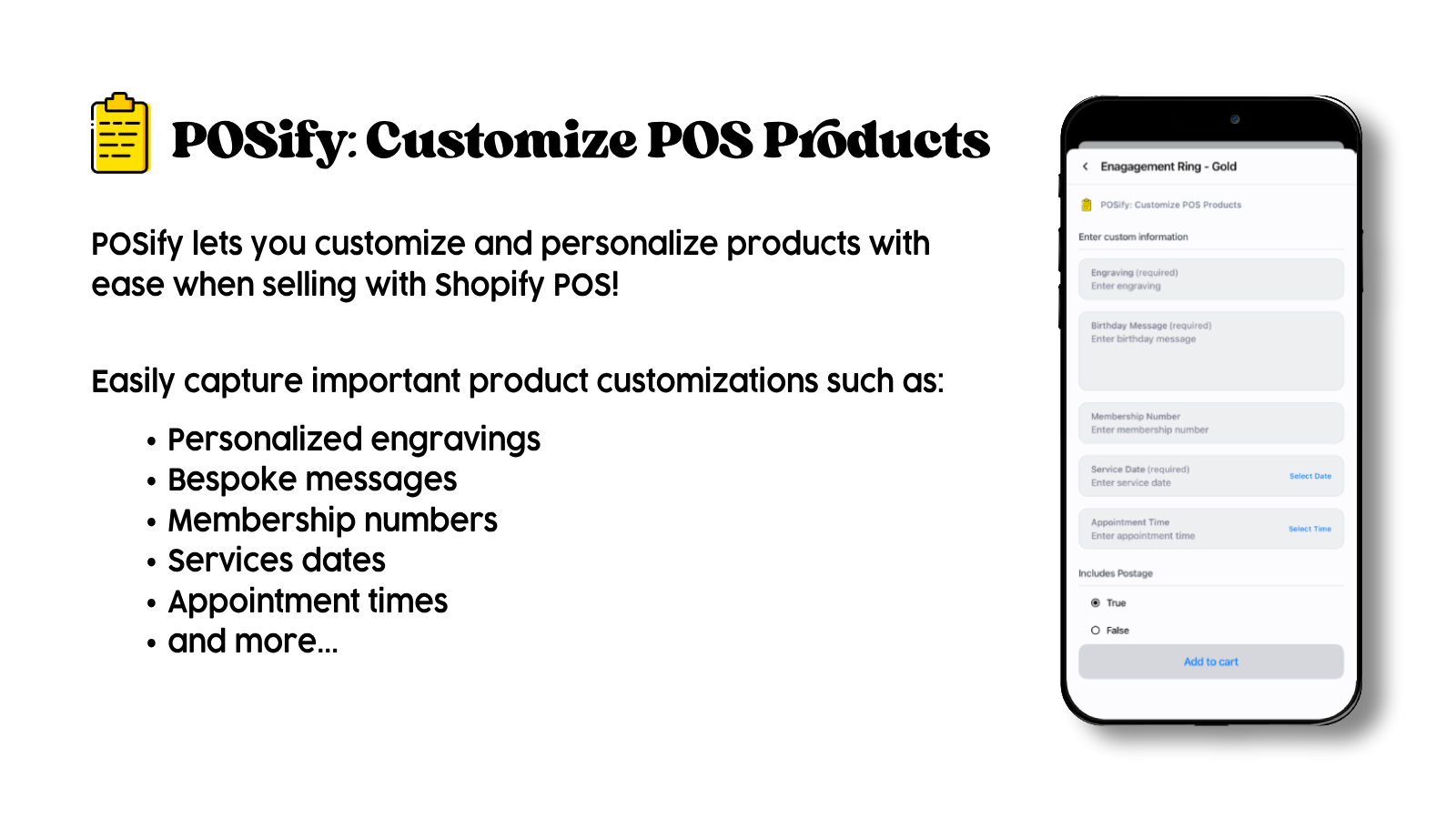 POSify allows Shopify store owners to easily capture important product customisations — like engravings,